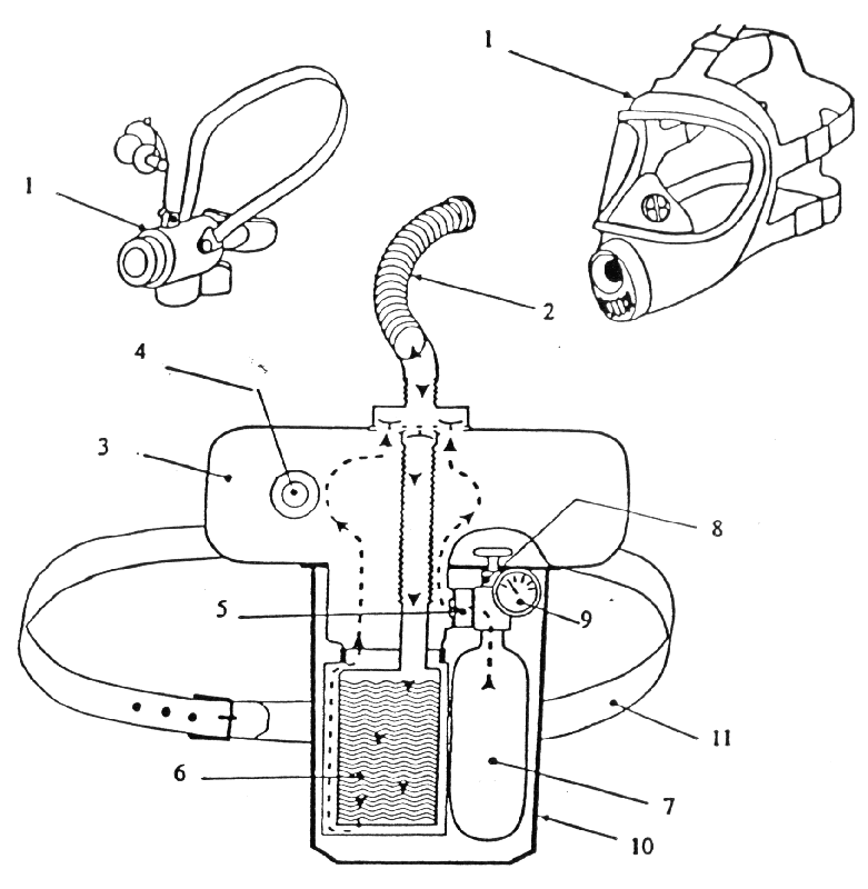 1. Część twarzowa 2. Wąż oddechowy 3. Worek oddechowy 4. Zawór upustowy 5. Reduktor ciśnienia 6. Absorber CO2 7. Zawór butli 8. Butla z tlenem 9. Manometr 10. Obudowa 11. Pas biodrowy