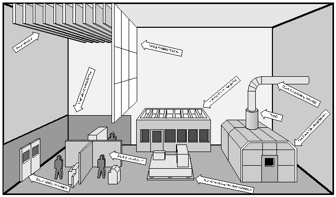 Jak już wspomniano we wstępie jednym ze sposobów ograniczenia hałasu na stanowiskach pracy w przemyśle jest stosowanie kabin dźwiękoizolacyjnych. Ogólny schemat różnych zabezpieczeń przeciwhałasowych stosowanych w halach przemysłowych przedstawiony jest na rys.2.1.