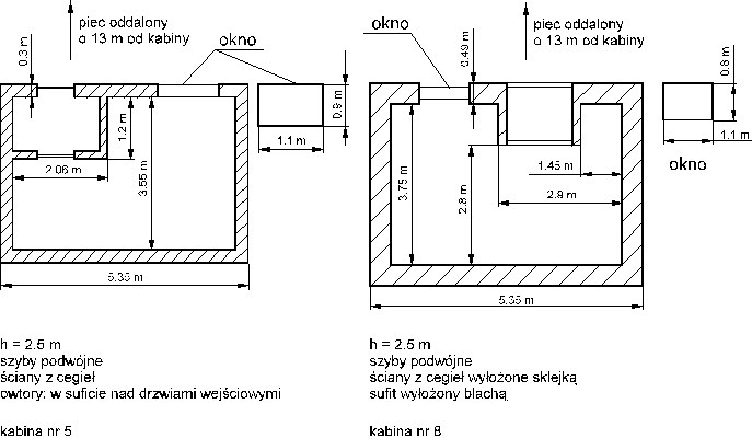 Kabiny murowane są indywidualnie projektowane dla konkretnego stanowiska pracy. Wymiary kabiny, grubość ścian, liczba okien i drzwi  powinny być tak zaprojektowane, aby uwzględniać widmo hałasu, lokalizację maszyny i wielkość urządzeń sterowniczych. Przykładowe rozwiązania konstrukcyjne kabin murowanych  przedstawione są na rys. 2.5. Kabiny te posiadają przedsionek i podwójne drzwi.