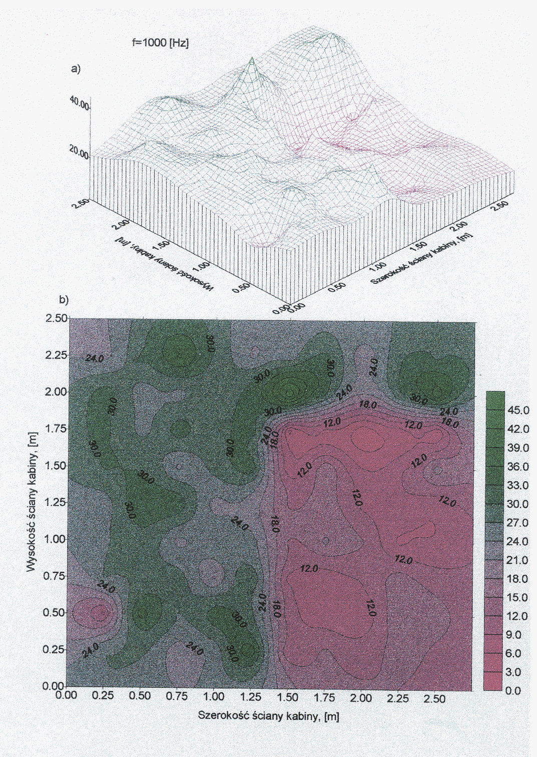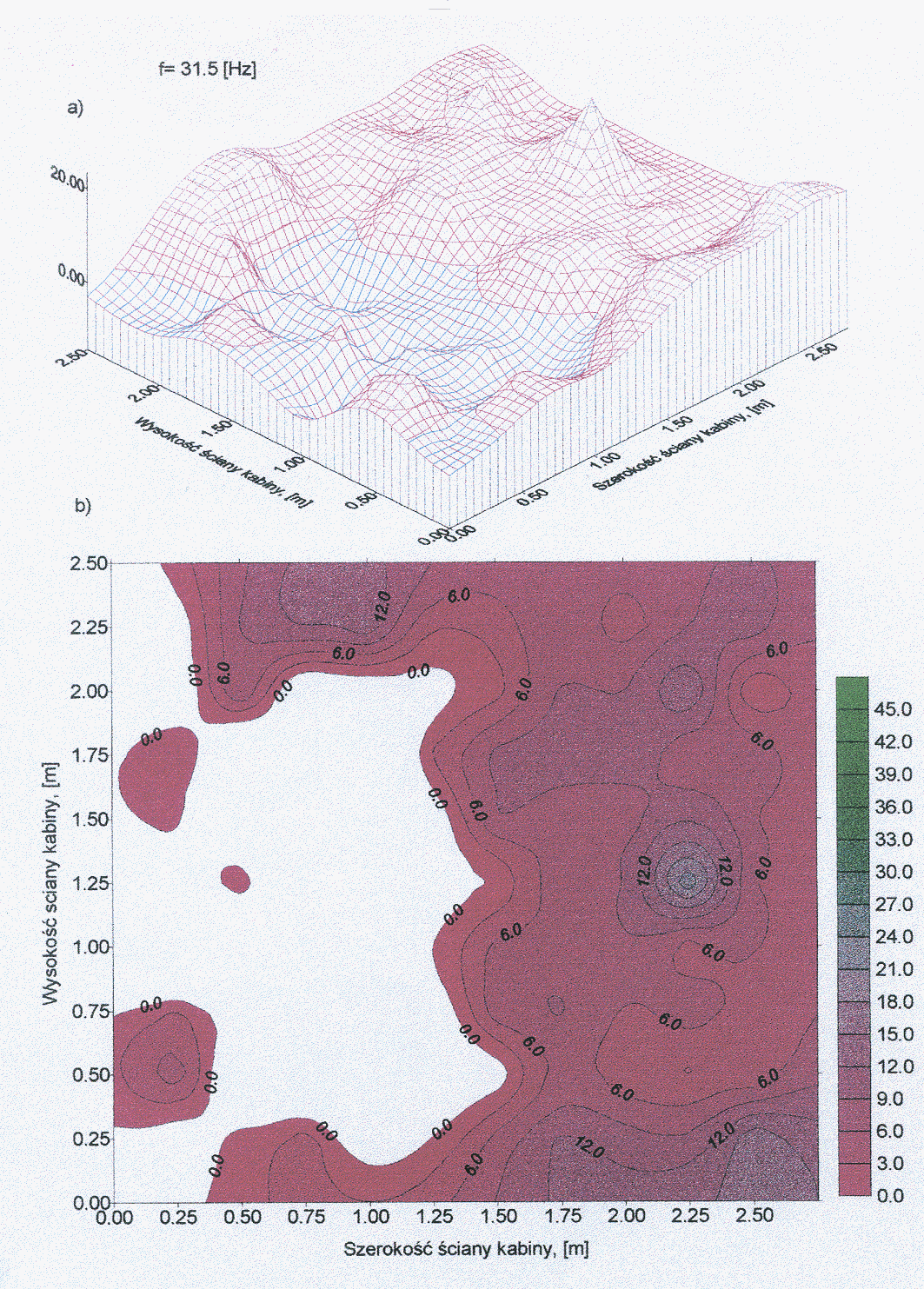 Dla prezentacji otrzymanych wyników pomiarowych wykonano mapy akustyczne różnicy wartości składowych wektora natężenia dźwięku prostopadłych do ściany kabiny, mierzonych od strony zewnętrznej jak i wewnętrznej, uwzględniających rozkład natężenia dźwięku na poszczególnych ścianach. Przykładowe mapy akustyczne obrazujące różnicę składowych “z” wektora natężenia dźwięku prostopadłych do płaszczyzny ściany kabiny dźwiękoizolacyjnej, mierzonych na zewnątrz i wewnątrz ściany kabiny (a - siatka 2D, b- siatka 3D) dla częstotliwości środkowej pasma oktawowego równej 31.5Hz oraz 1000 Hz przedstawione są na rys. Z.6 i Z.7.