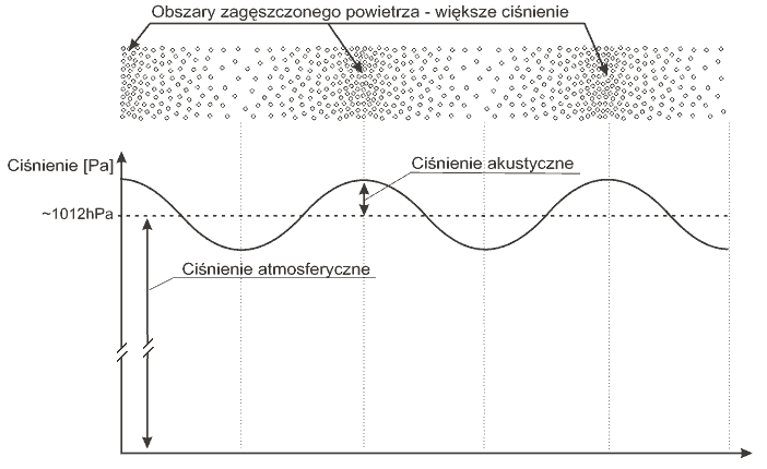 Zagęszczenia i rozrzedzenia cząstek powietrza będące wynikiem propagowania się dźwięku wywołują niewielkie zmiany ciśnienia w tych obszarach powietrza. W miejscach, w których cząsteczki powietrza są zagęszczone (Rys. 3), ciśnienie powietrza jest nieco wyższe niż ciśnienie atmosferyczne, natomiast w miejscach gdzie są one rozrzedzone ciśnienie jest niższe niż atmosferyczne. Te niewielkie zmiany ciśnienie nazywamy ciśnieniem akustycznym oznaczanym symbolem "