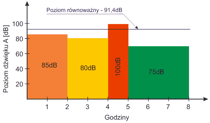 Często zdarza się, że pracownik w ciągu zmiany roboczej wykonuje pracę na różnych maszynach, które generują hałasy o różnych poziomach ciśnienia akustycznego. W takim przypadku aby określić jakie ryzyko niesie ze sobą dla pracownika oddziałujący na niego w ciągu zmiany hałas należy wyliczyć równoważny poziom dźwięku A. Równoważny poziom dźwięku A jest to taki poziom dźwięku A, który działając przez taki sam czas jak hałas o zmiennym poziomie ciśnienia akustycznego, niesie ze sobą taką samą energię i takie samo ryzyko uszkodzenia słuchu. Na Rys. 6 przedstawiono przykład zmian poziomów dźwięku A hałasu w ciągu 8-godzinnego dnia pracy. Pracownik pierwsze dwie godziny pracował w hałasie o poziomie dźwięku A równym 85 dB, następne dwie godziny w hałasie o poziomie dźwięku A równym 80 dB, następnie godzinę w hałasie o poziomie dźwięku A równym 100 dB i trzy godziny w hałasie o poziomie dźwięku A równym 75 dB. Z punktu widzenia narażenia zawodowego odpowiada to sytuacji, w której pracownik pracowałby osiem godzin w hałasie o poziomie dźwięku A równym 91,4 dB.