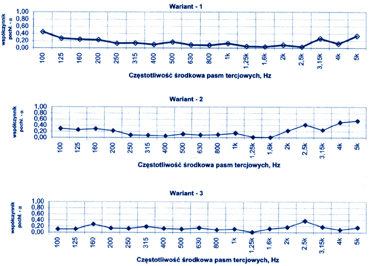 Rys. 4. Pogłosowy współczynnik pochłaniania dźwięku dla wybranych wariantów ustrojów rezonatorowych: wariant l - 32 komory, 32 otwory, wariant 2-32 komory, 32 otwory, wypełnienie wełna mineralna, wariant 3-32 komory, 32 otwory, wypełnienie pianka poliuretanowa