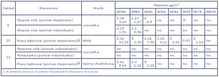 Podczas badań obsługa pras bębnowych oraz ciągów do wulkanizacji w stopionych solach wyposażona była w indywidualne próbniki. Stacjonarne stanowiska pomiarowe były umieszczone nad bębnami, w przypadku pras bębnowych - w miejscu wyjścia gotowego wyrobu z wanny ze stopioną solą. Uzyskane wyniki badań przedstawiono w tabeli 1. Liczby podane w tabelach odpowiadają najwyższym i najniższym zmierzonym stężeniom.