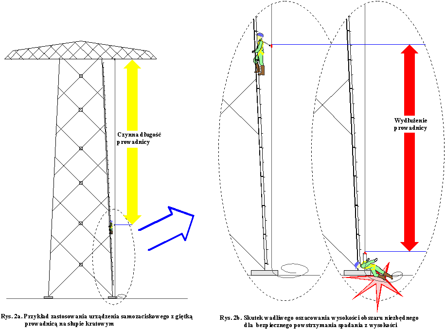 W praktyce o wielkości drogi powstrzymywania spadania decyduje głównie wydłużenie podzespołu łącząco-amortyzującego. Problem ten jest szczególnie istotny w przypadku podzespołów łącząco- amortyzujących zawierających elementy włókiennicze np. amortyzatorów włókienniczych oraz urządzeń samozaciskowych z giętkimi prowadnicami wykonanymi z lin włókienniczych. Problem ten jest tym bardziej istotny im w danym sprzęcie zastosowano dłuższy element włókienniczy. Z tego powodu najdłuższej drogi powstrzymywania spadania należy się spodziewać dla urządzeń samozaciskowych stosowanych z dużą czynną długością prowadnicy (odcinkiem prowadnicy pomiędzy punktem kotwiczenia a mechanizmem samozaciskowym - jak to przedstawiono na rys.2a).